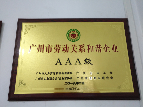 广州广安投资有限公司荣获广州市人力资源和社会保障局、广州市总工会等单位颁发的“广州市劳动关系和谐企业AAA级”企业称号。